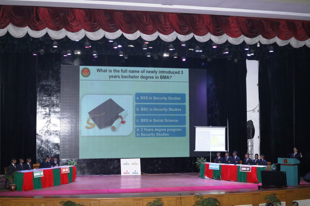The academy arranges a good number of co-curricular activities for the overall grooming and mental development of the officer cadets. As a part of that, Inter Company Brain Trust Competition is held here once in every year with the active participation of the officer cadets of different terms and courses. The competition is held to inculcate amongst the officer cadets a spirit of a healthy competition, team effort and ability to keep pace with the latest updates in various fields of knowledge. The academic wing of the academy conducts this colourful and attractive event, gouping the cadets under four companies. The participants of the competition are selected from the preliminary round where all the cadets except those of the first term take part. The final round of the competition is conducted in different four phases namely, Open Buzzer Round, Own Choice Round, Rapid Fire Round and Multiple Choice Round. The event turns colourful and joyous with the vibrant participation of the officer cadets.