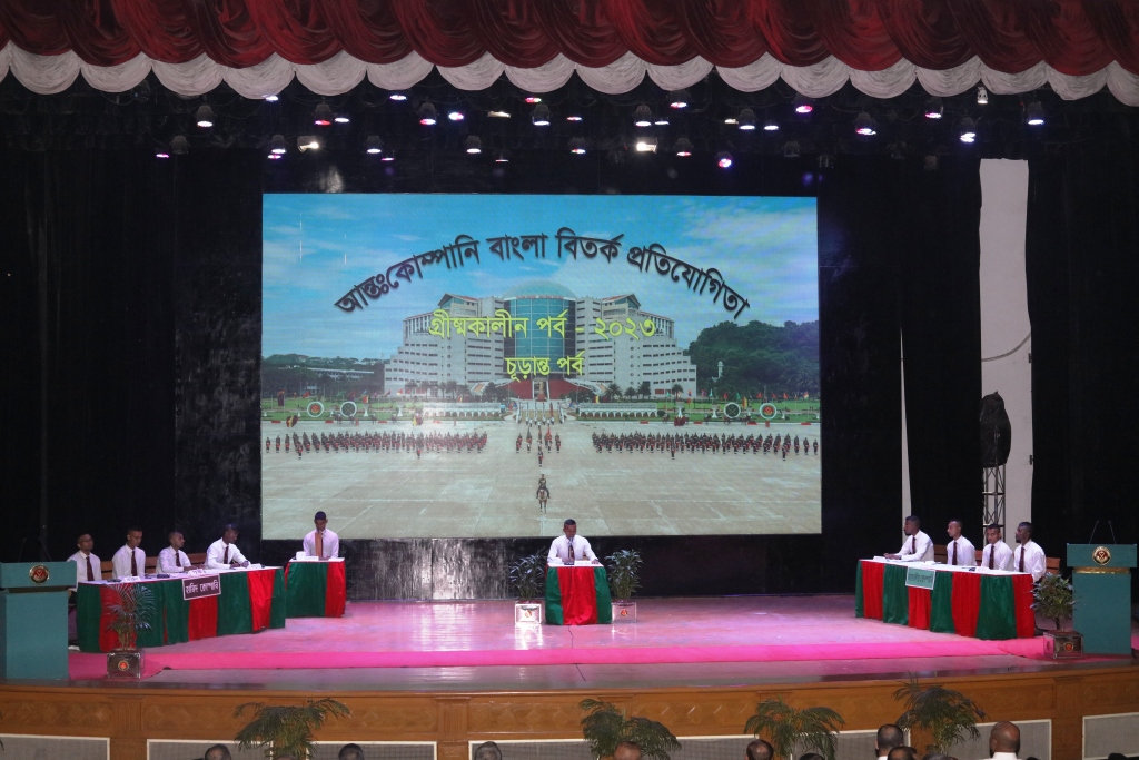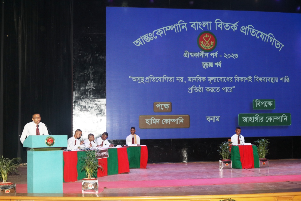 Debate Competition takes place in each Term for the officer cadets of Second, Third, Fourth, Fifth and Final Term cadets of the four companies, namely Jahangir, Rouf, Hamid and Mustafa Company. The Summer Term is dedicated for the Bangla Debate Competition and the Winter Term is dedicated for the English Debate Competition. Debate has got a cutting-edge to assess the academic performance of the cadets. It gives a reflection of their achievement and excellence of the academic objectives.